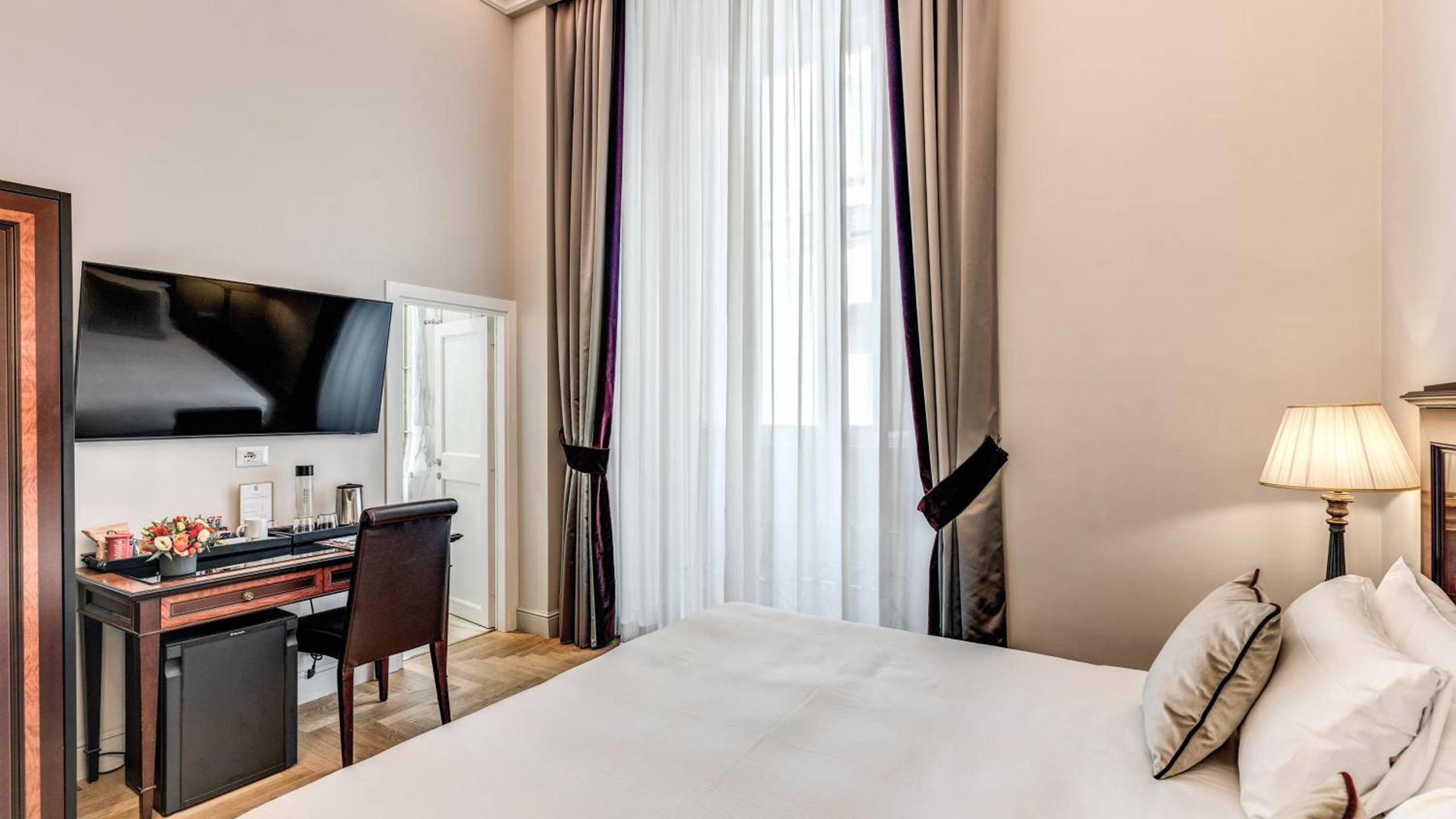 Una camera doppia ampia e luminosa, con letto Queen Size extra-comfort e arredi curati nei dettagli. I pavimenti originali del palazzo seicentesco donano un’atmosfera autentica, immersa nella storia del Palazzo Pamphilj. È la soluzione ideale per coppie o ospiti business che desiderano maggiore spazio e comfort. Il bagno privato dispone di doccia, asciugacapelli professionale e set di cortesia.