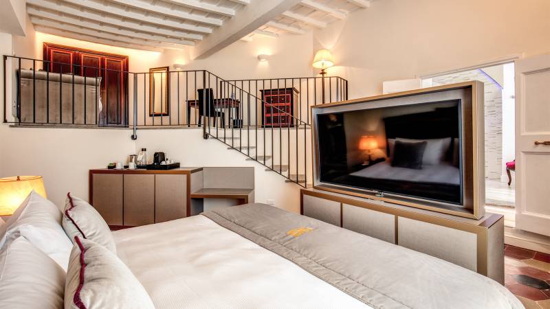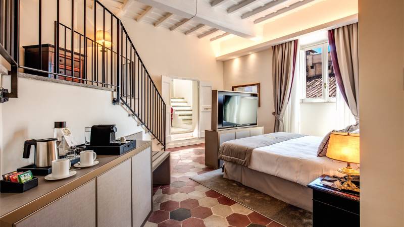 Номера категории Делюкс таят в себе различные истории о древниx интригах дворца. Советуем Вaм обратиться к персоналу отеля, чтобы узнать подробнее историю каждого номера. В номерax имеются все основные удобства отеля Eitch. Наши гости останавливают свой выбор на этих номерах из-за красоты великолепных фресок с цветочными мотивами и оригинальных деревянных буазери. Каждый номер был в центре заговоров и интриг римской знати, а некоторые из них даже имели тайные ходы, использовавшиeся для попадания и покидания дворца незамеченным. История здания связана не только с именем Папы Иннокентия Х Памфили, по воле которого оно было построено, но и с именем экстравагантной Донны Олимпии Майдалькини по прозвищу «Пимпачча», с личностью которой были связаны буквально все городские хроники Рима XVII века.