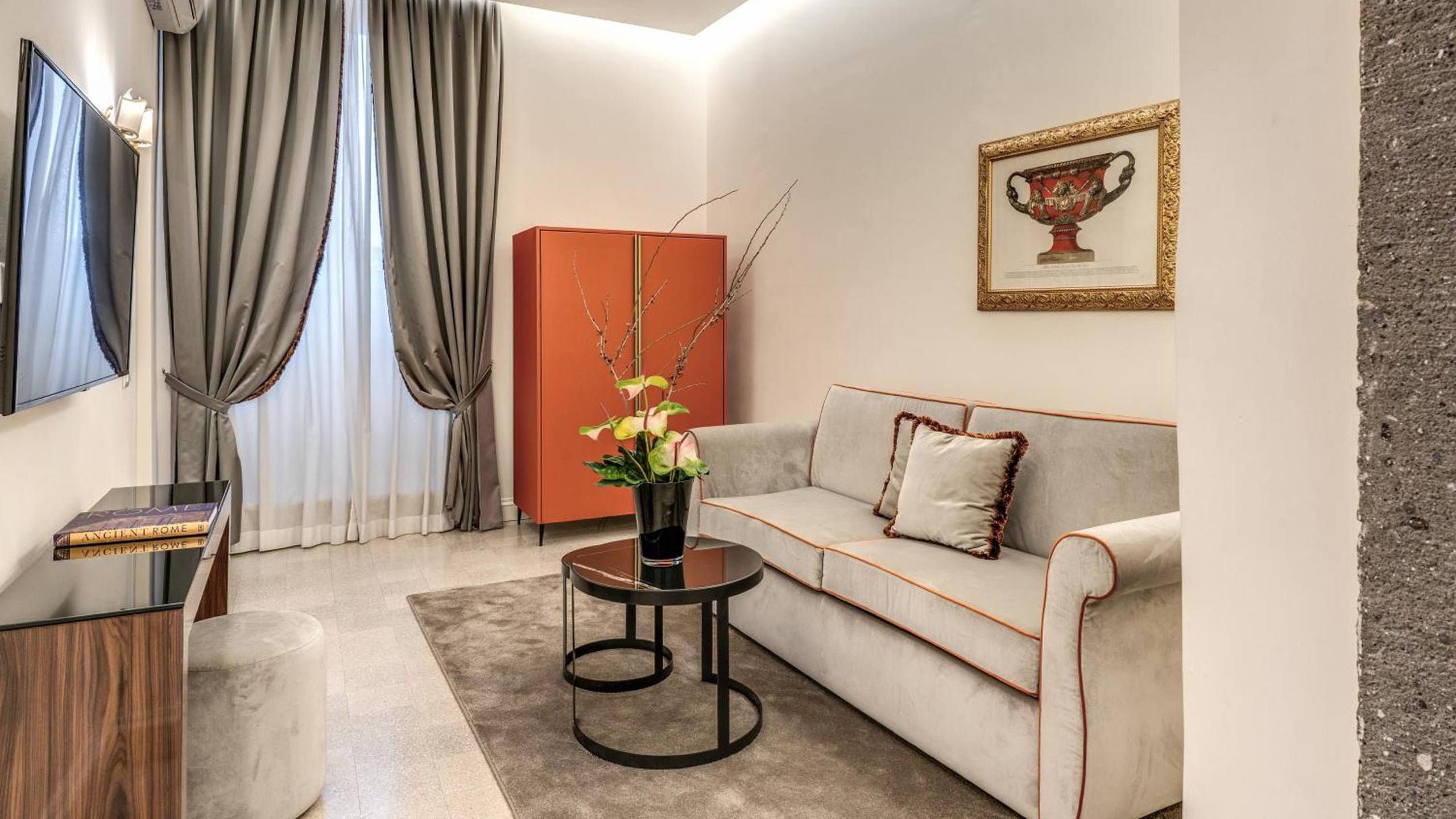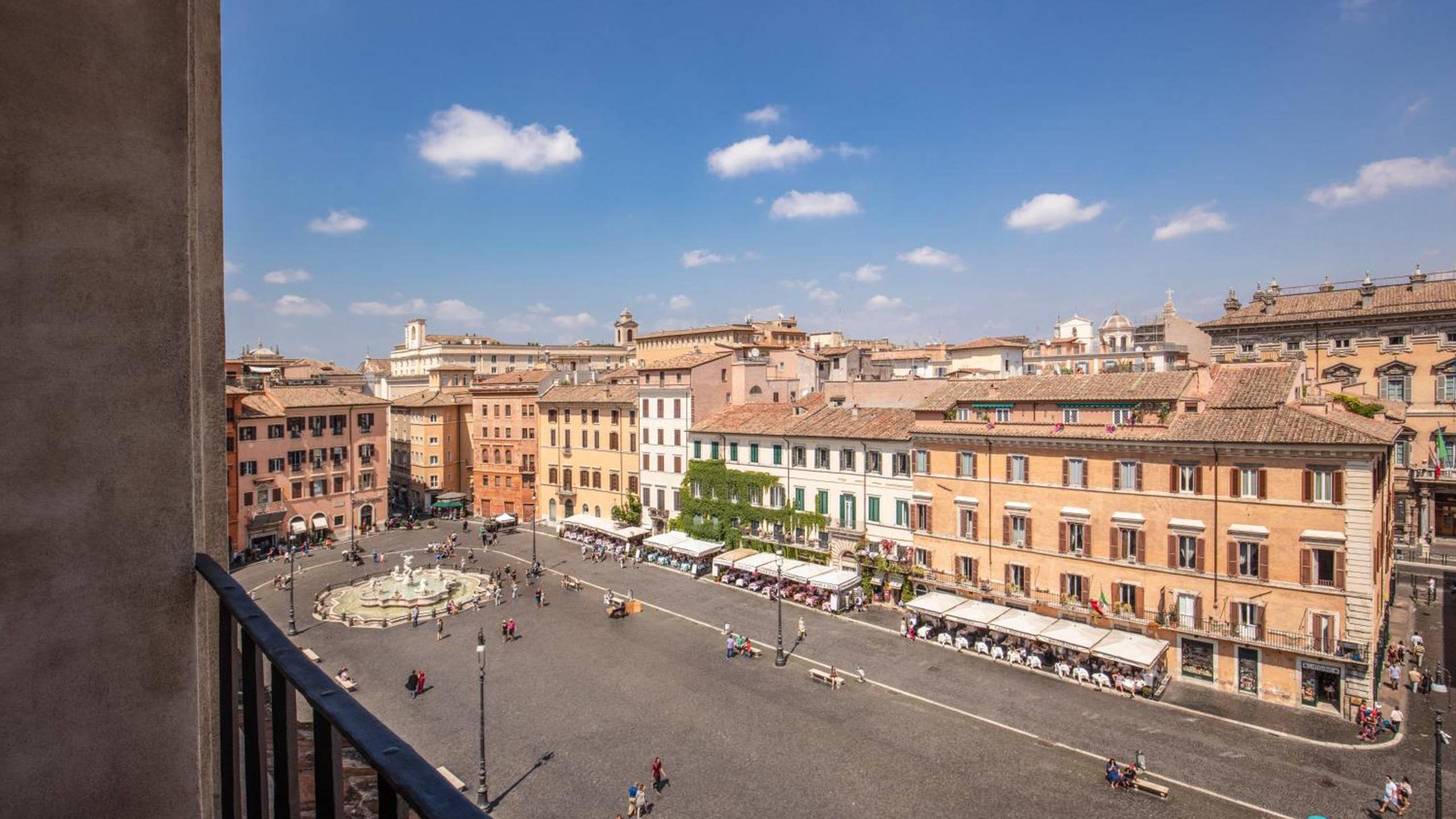 Ogni suite offre una prospettiva diversa sulla città: scorci unici su cupole, tetti storici, campanili o sulla piazza sottostante, trasformando ogni risveglio in un quadro romano irripetibile. Soggiornare in una Deluxe Suite con Vista significa vivere il privilegio di contemplare la Città Eterna da un punto d’osservazione riservato, un tempo accessibile solo alla Curia o alla nobiltà Pamphilj.