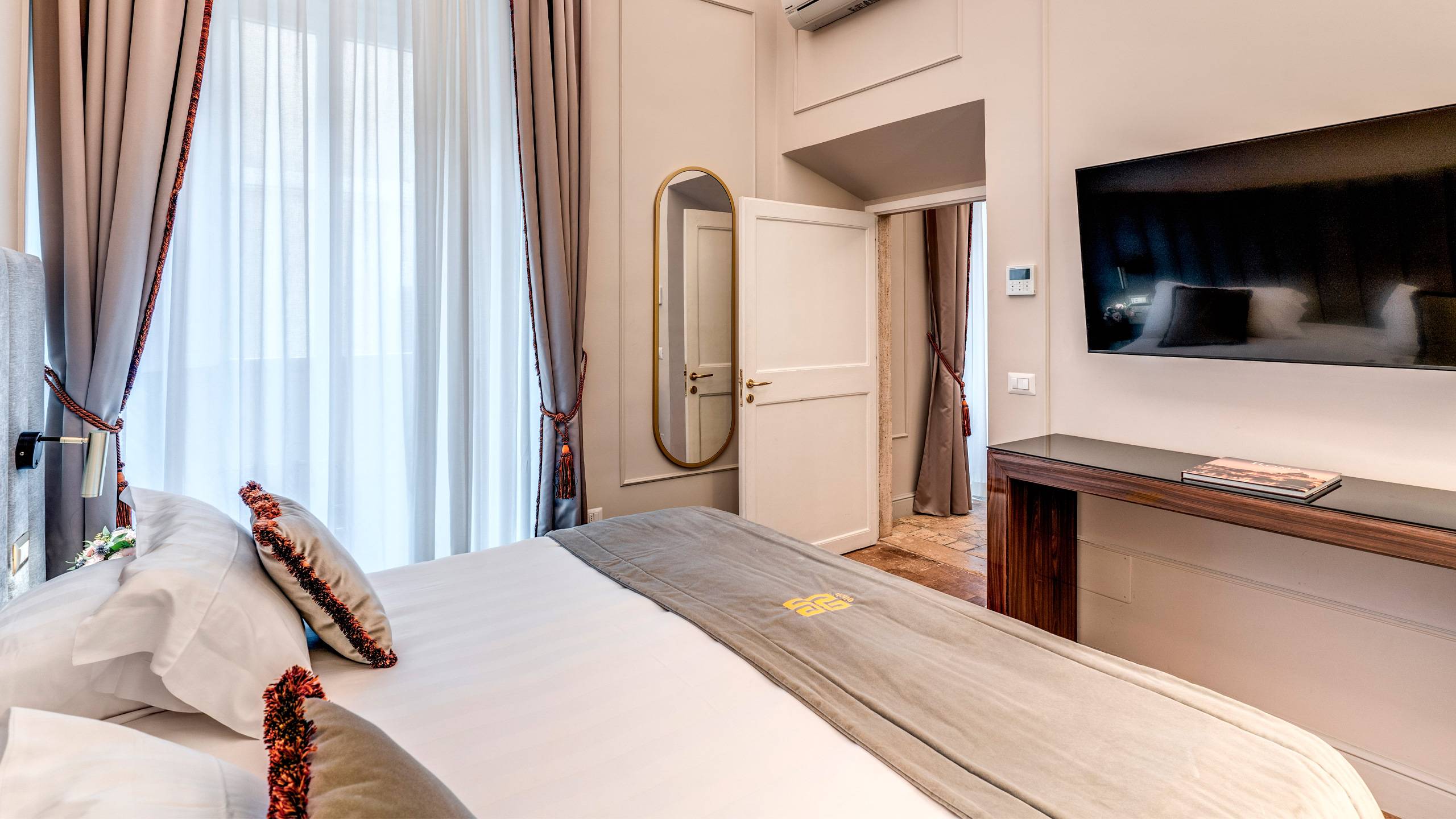 Le Deluxe Suite combinano ambienti spaziosi e confortevoli con l’anima più scenografica del palazzo. Ogni suite è diversa: alcune presentano affreschi floreali secenteschi, altre conservano boiserie originali o antichi passaggi nascosti, testimonianze rare della storia del Collegio Innocenziano. Gli spazi sono ampi, luminosi e arredati con cura, offrendo un soggiorno elegante e rilassante. La loro identità è legata alle vicende della famiglia Pamphilj e alla figura di Donna Olimpia Maidalchini, la celebre “Pimpaccia”, che nel Seicento ebbe un ruolo centrale nelle fabbriche Pamphilj e, secondo la tradizione, supervisionò i lavori del palazzo stesso.